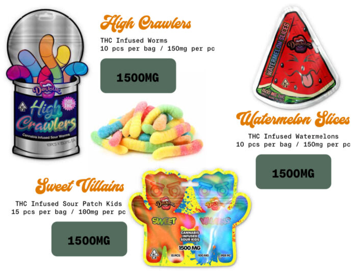 $8.50- HIGH CRAWLERS – SWEET VILLAINS – WATERMELON SLICES – PEACH SOUR RINGS – SOUR APPLE RINGS – PINK LEMONADE SOUR RINGS – WATERMELON SOUR RINGS